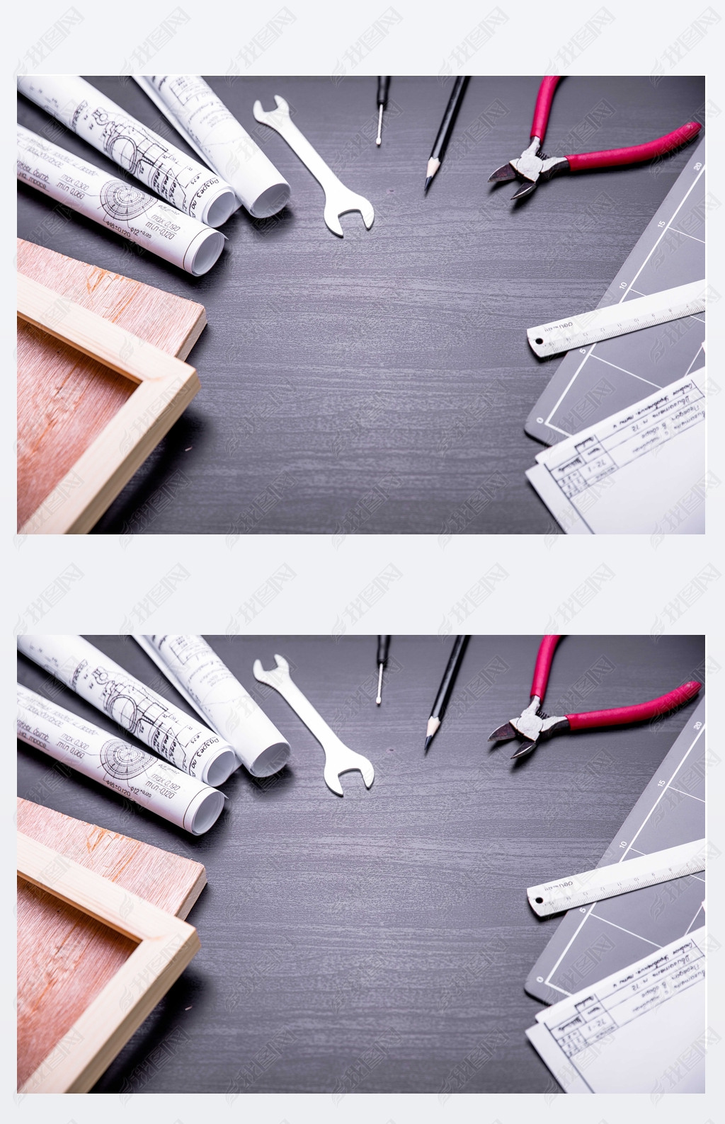 工程图纸做图工具平铺在桌面上