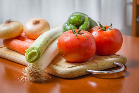新鲜的不行蔬菜漏勺和在反对现代厨房砧板