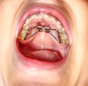 儿童佩戴正畸腭扩张训练器。隐形大括号
