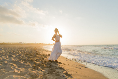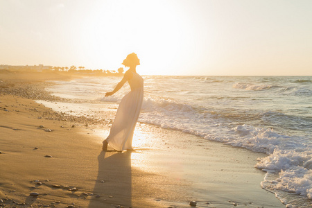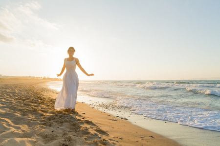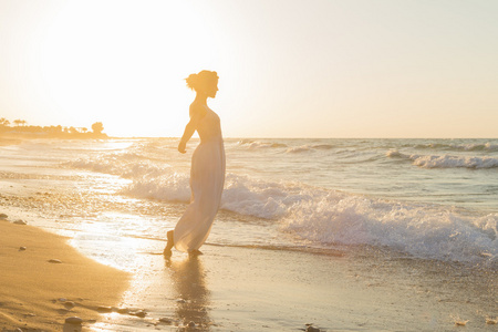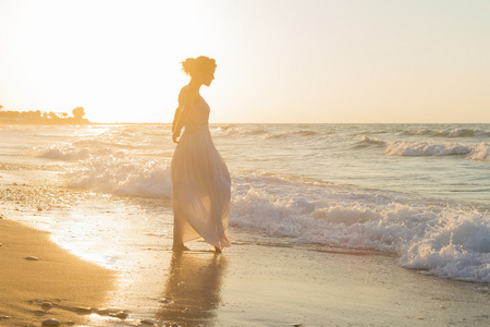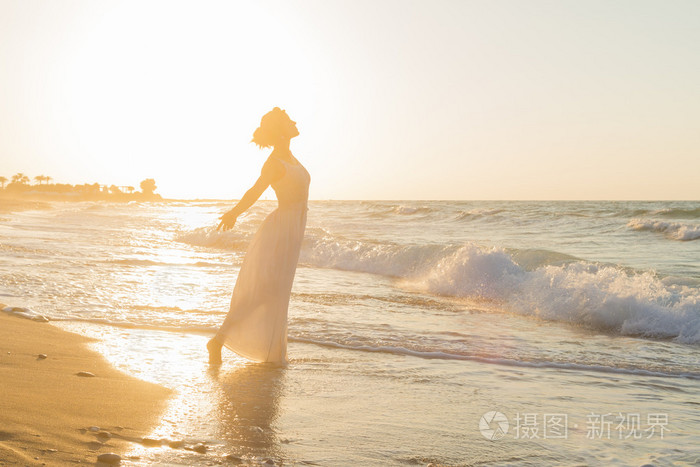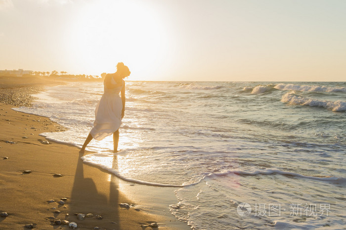 年轻的女人喜欢在黄昏时分朦朦胧胧的海滩