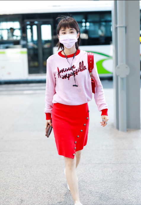 王子文穿粉色字母卫衣搭配红色短裙现身