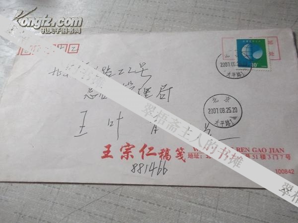 著名作家、散文家王 宗 仁信札1张 带实寄封