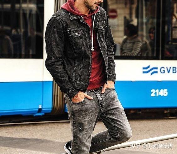牛仔外套红色卫衣搭配裤子和鞋子推荐?