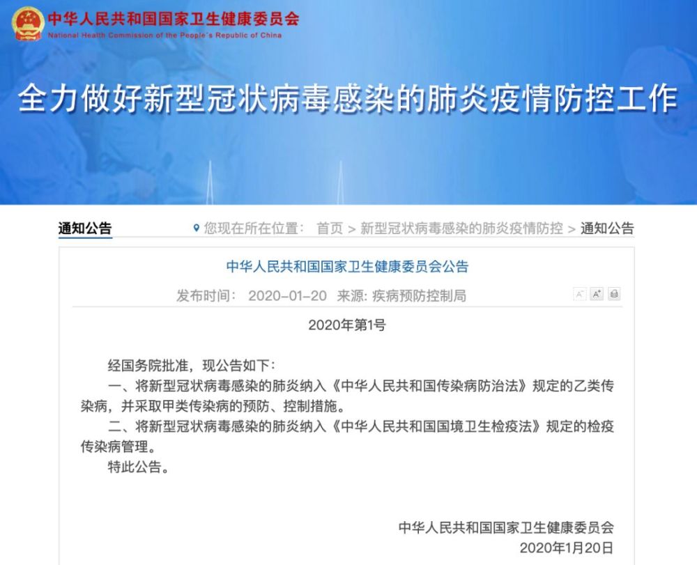 肺炎纳入乙类传染病,采取甲类防控措施!