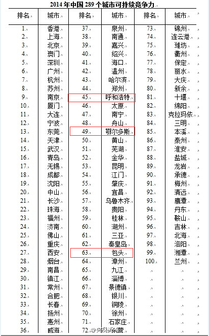 中国城市竞争力百强内蒙古呼包鄂上榜_