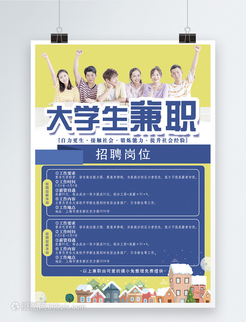 简介:大学生兼职是锻炼大学生的一种方式。如何获取兼职1.定期查看学生所在地的招聘类报纸,很多商家找促销员和发