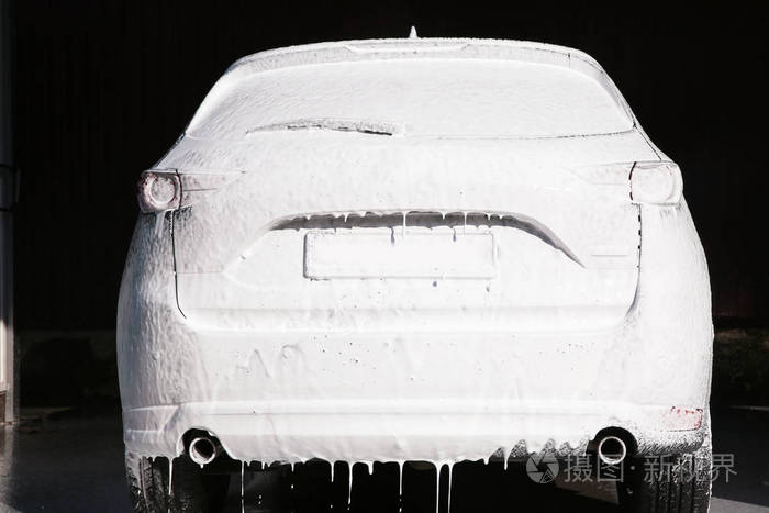 手动洗车。用白色泡沫洗涤剂清洗豪华车。汽车清洗自助服务