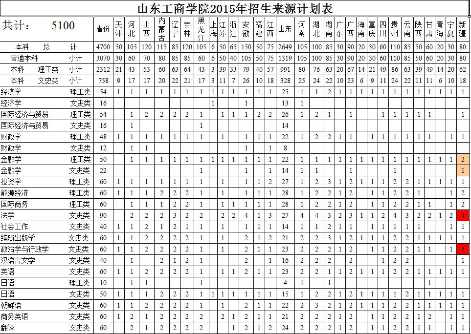 山东工商学院2015年招生来源计划表