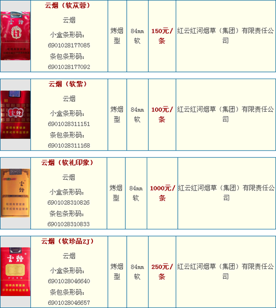 2015】最新云烟价格表和图片