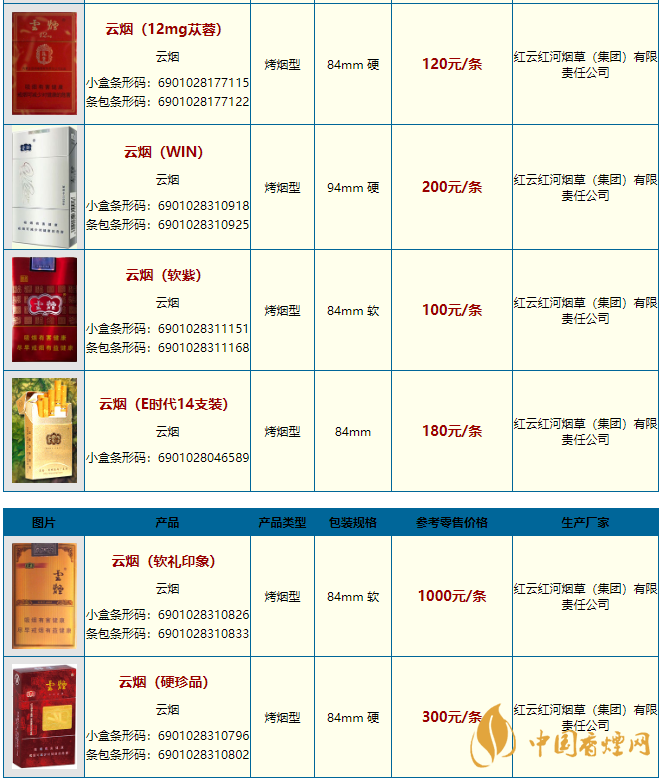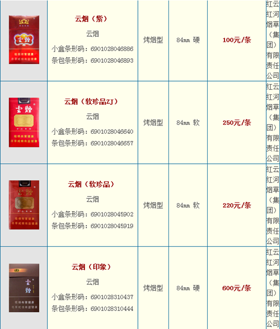 云烟所有价格表图片