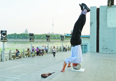 武汉78岁古稀老人玩倒立 引起市民围观(图)