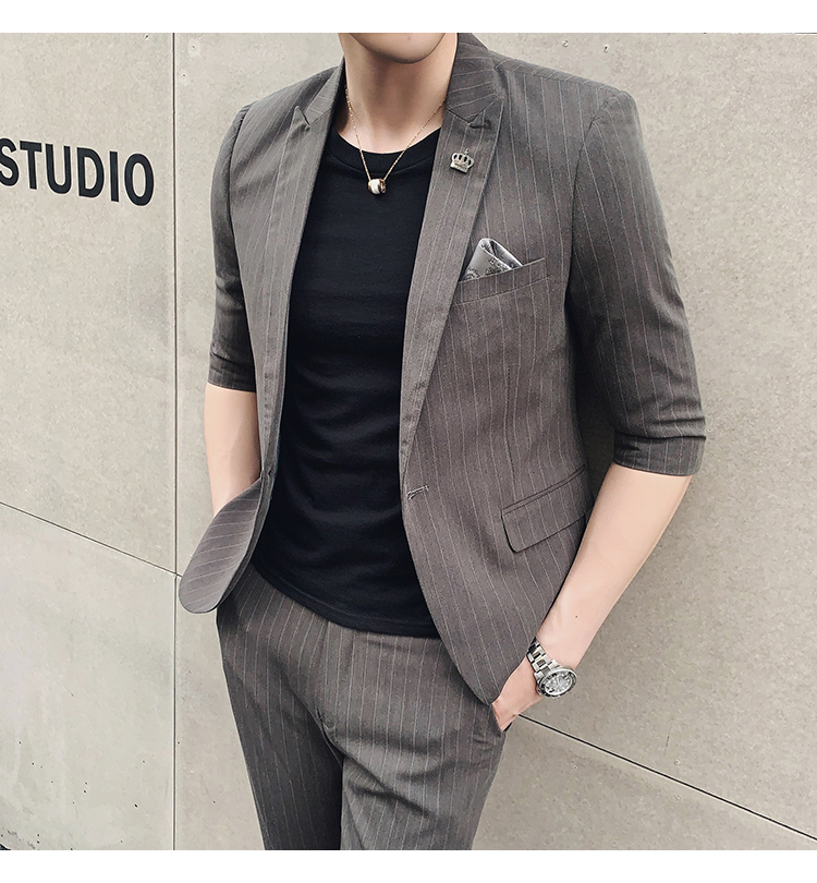 春夏款 韩版修身条纹中袖男士西服+九分喜