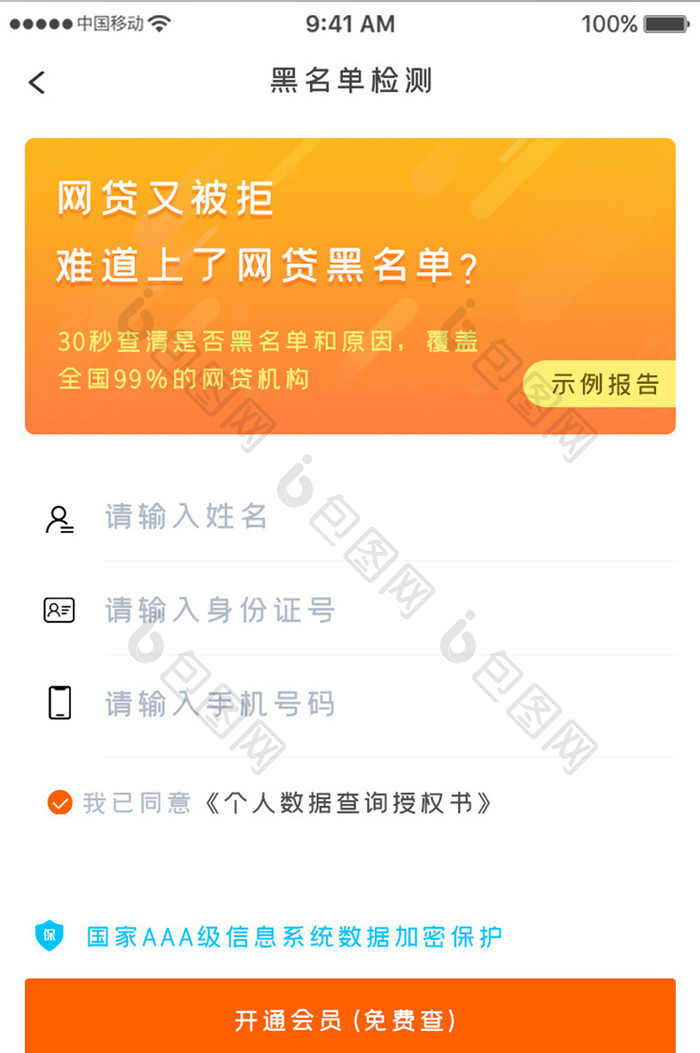 橙色渐变个人信用产品黑名单检测移动界面