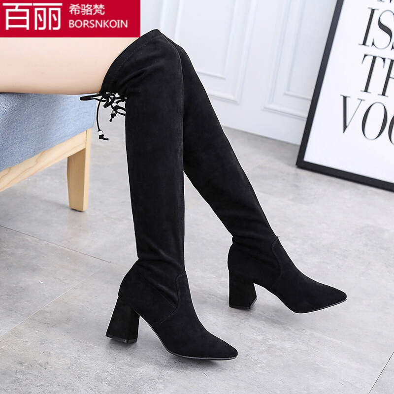 百丽希骆梵女靴6cm粗跟过膝长靴女学生长