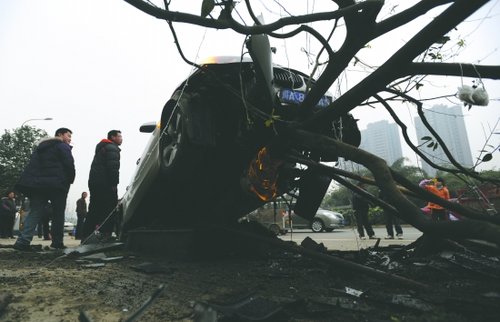 成都一宝马撞上花台 骑在树上一下午(图)
