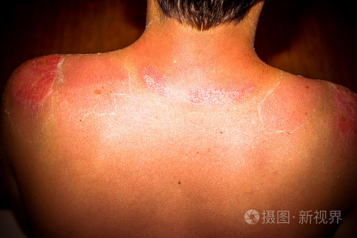 关闭一个非常糟糕的晒伤回来男人的皮肤的细节