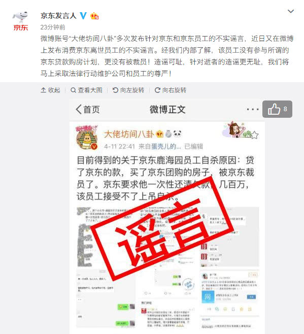 京东斥大佬坊间八卦微博造谣离世员工:将