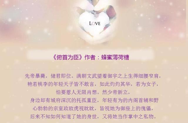 简介:《俯首为臣》是连载在晋江文学的一本言情类网络小说,作者是蜂蜜薄荷糖。
