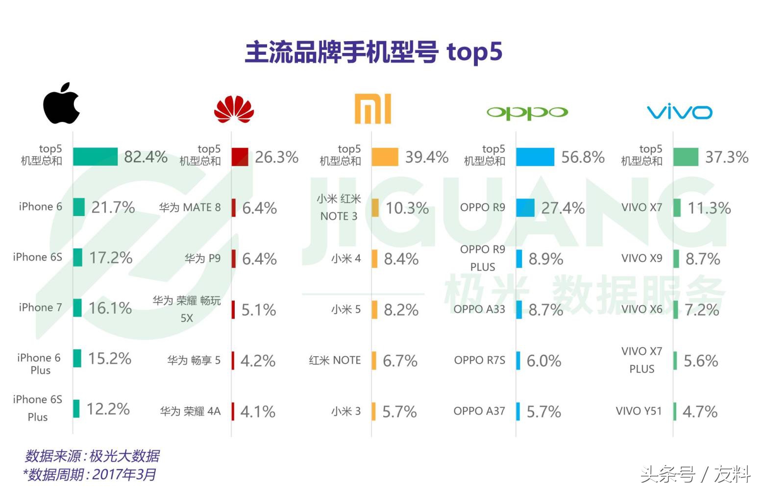 手机2017销量排行榜 苹果小米荣耀华为屠