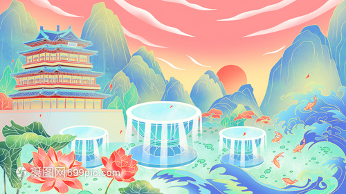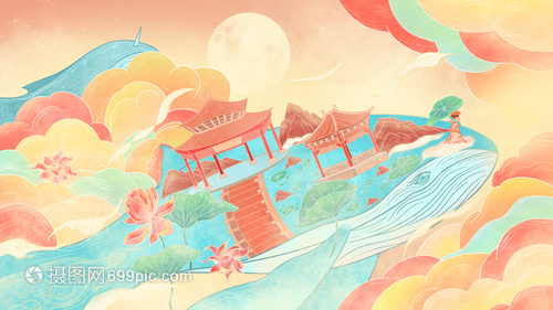鲸鱼建筑中国风插画