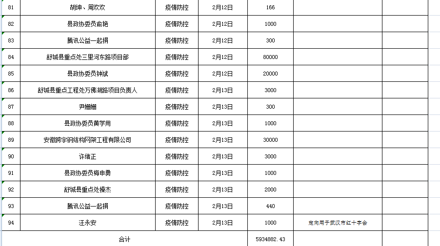 舒城县红十字会接受捐赠公示(截止2月13日)