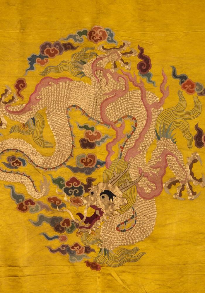清代 明黄地盘金绣打籽绣龙纹挂帐