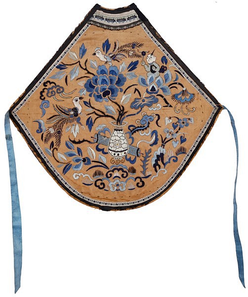 杏黄缎三蓝打籽绣平安富贵纹扇形肚兜