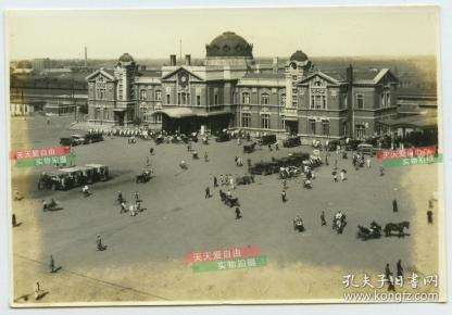 民国东北满洲沈阳奉天火车站站前广场全景老照片,停车场,公交车等待上客,售票员在招揽到站旅客,泛银
