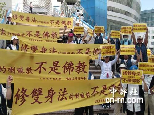 达赖法会讲笑话 场外民众抗议喇嘛骗财色[