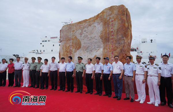 三沙市地名碑揭碑 碑由60多吨黄蜡石雕刻