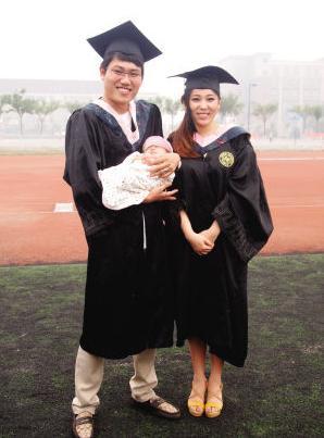 大学产子女生一家三口拍毕业照 已顺利毕业