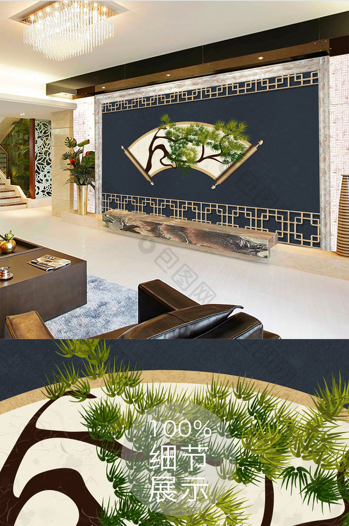 新中式金色铁艺复古卷轴古松背景墙
