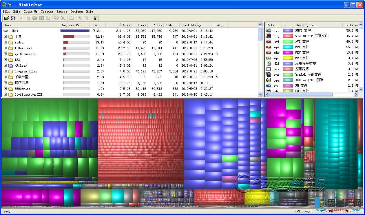 简介:WinDirStat 是一款免费的硬盘容量统计软件,它能够以全彩的方式来呈现不同的文件在硬盘中占去的空间大小,