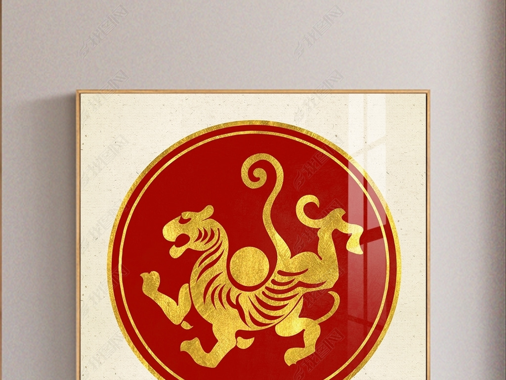 新中式四方神兽之白虎鎏金晶瓷画圆形装饰画