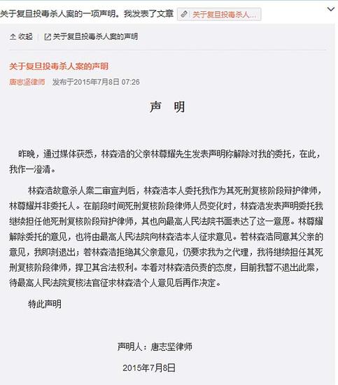林森浩投毒案律师唐志坚声明:暂不退出