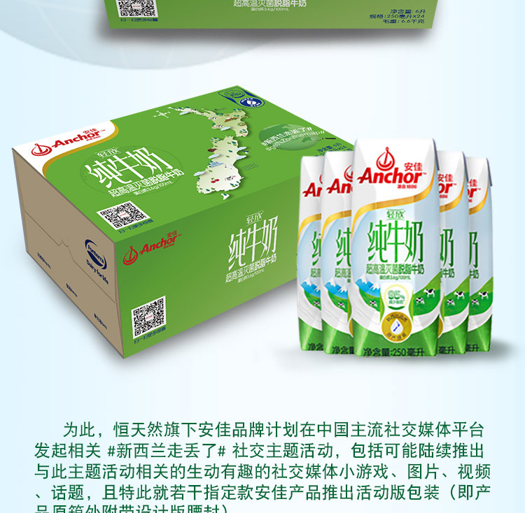 新西兰原装进口安佳(Anchor)轻欣纯牛奶超