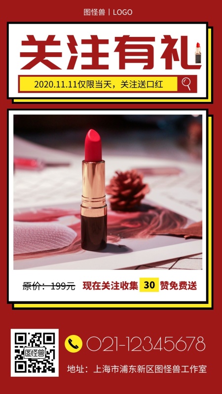 双十一关注有礼创意红色简约手机营销海报