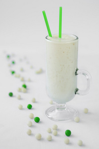牛奶酸奶奶昔鸡尾酒绿色和白色糖果下降