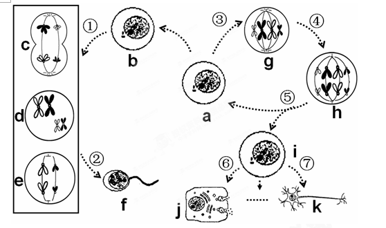 下图中①→⑦为某种哺乳动物的部分生命活动过程,a→k代表该种哺乳动物的不同细胞,细胞b代表精原细胞,请据图分析下列问题。