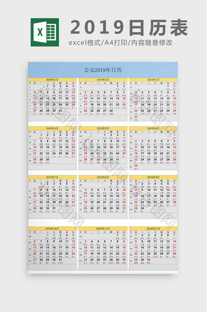 2019年日历打印表模板免费下载_XLS图片设计素材_【包图网】