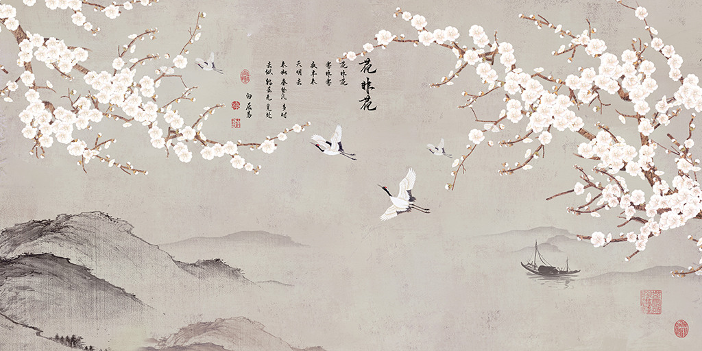 中式花非花诗词桃花水墨古典山水花鸟背景墙