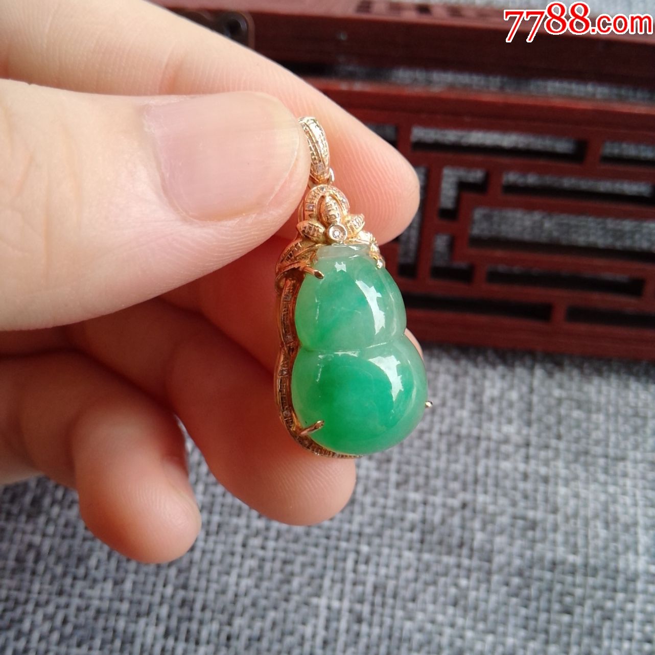 缅甸翡翠老坑冰糯种阳绿色翡翠葫芦玉吊坠18k金镶嵌翡翠挂件