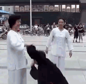 闫芳表演太极凌空劲,弟子上蹿下跳记者