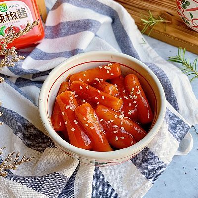 番茄炒年糕条,撒上葱花,摆上几根烤肠,色香味俱