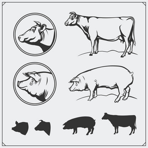 肉标签和设计元素。屠夫的业务标志。猪和牛