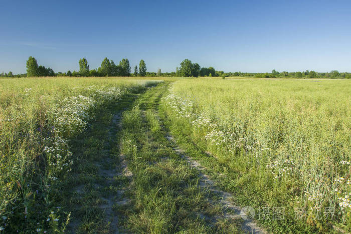 穿过油菜田野、树木和蓝天的乡间小路