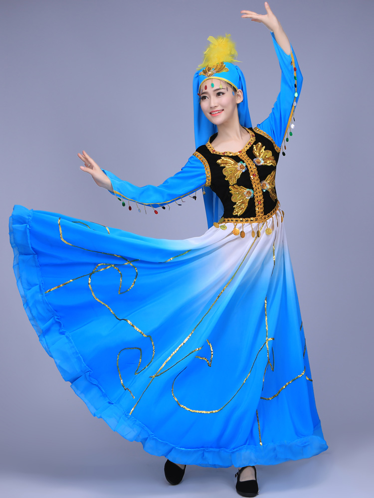 艺晨舞悦新疆舞蹈服厂家维族现代舞表演服装哈萨克舞蹈大摆裙回族服装定制