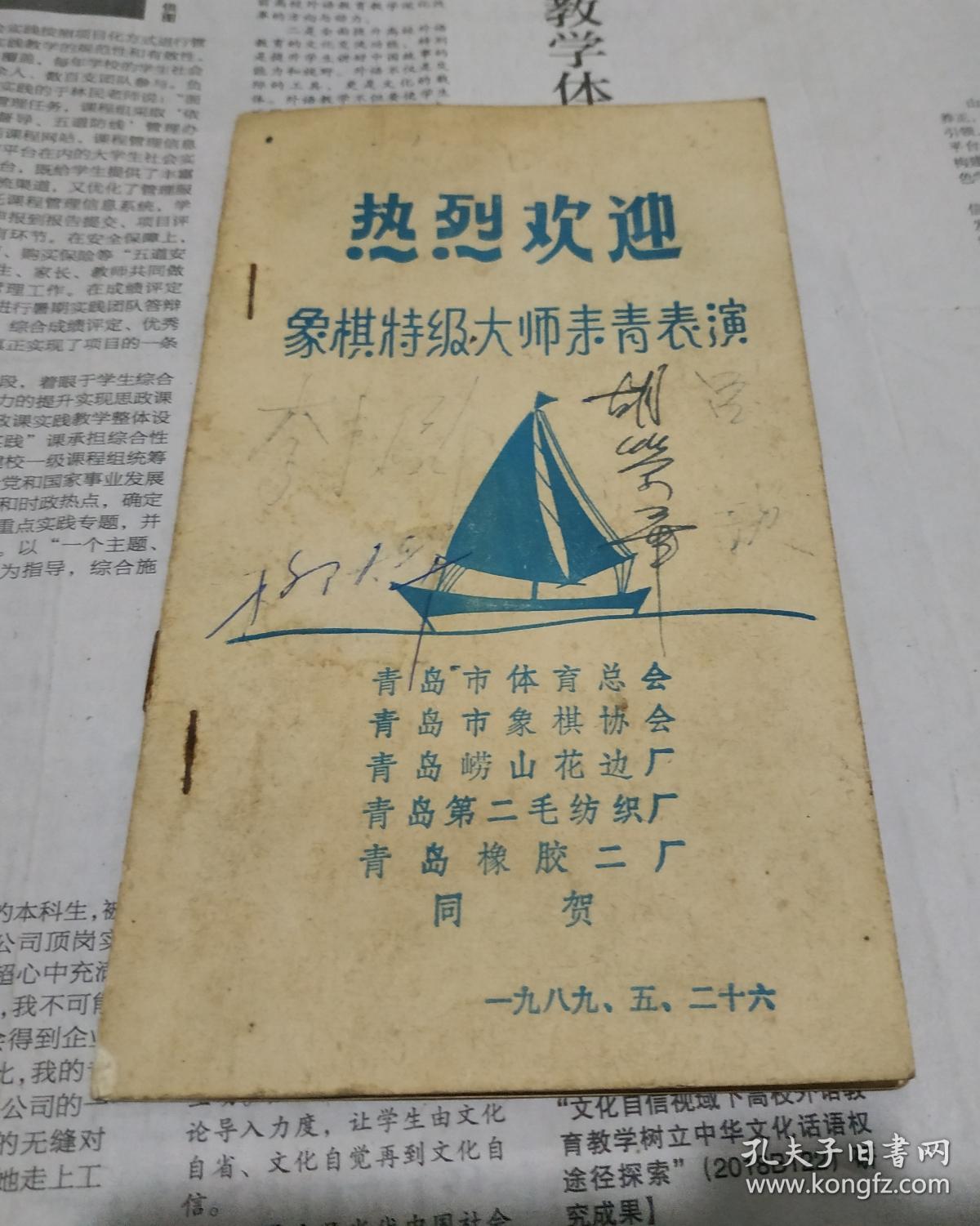 热烈欢迎象棋特级大师来青表演。胡荣华.