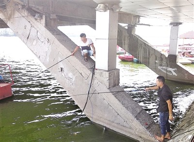 危险!南阳两名钓鱼爱好者在桥墩上钓鱼
