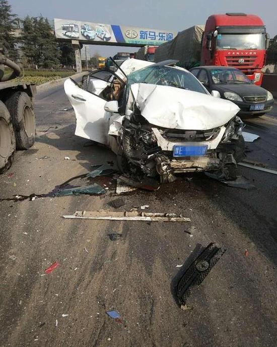 新乡两大车夹扁私家车 钢铁车身揉成面团